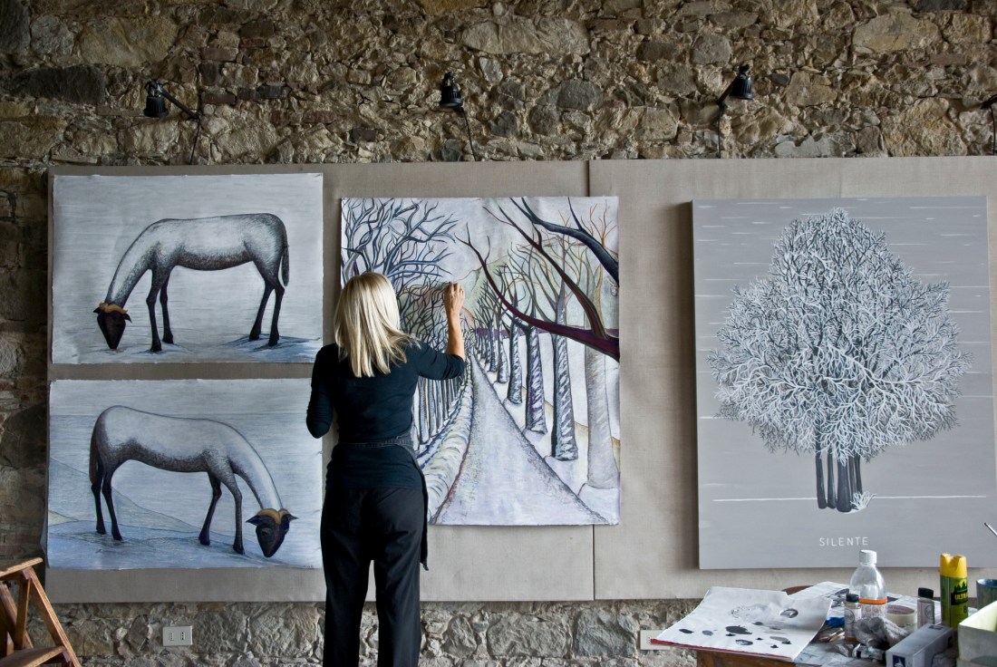 What started as paintings of the landscape has become the bare trees of winter often with simple words from Dante. Most recently these trees are presented in a moment of extreme weather that will exist for only a short time. In their silent beauty they have become a meditation on time and endurance.